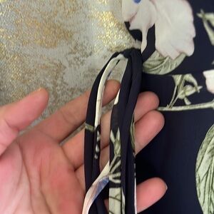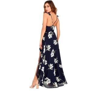 - You'll find everything you're looking for, and more with the Lulus All Mine Navy Blue Floral Print High-Low Wrap Dress! Breezy chiffon with a cream, peach, and green floral print sweeps over a strappy, ruffled wrap bodice with tying waist. High-low skirt with front slit.Fully lined