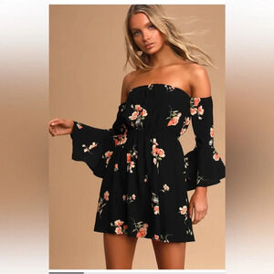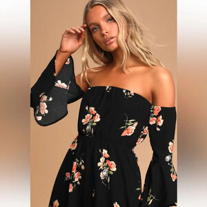 Lulus Lush Gardens Black Floral Print Off-The-Shoulder Mini Dress size small sexy