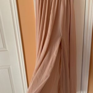 Blush powder pink underbody, front leg slit, back zipper closure.