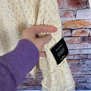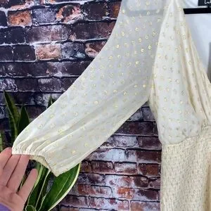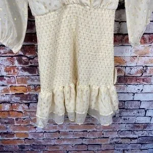 Elegant cream mini dress. Features a deep V-neck and long sleeves. Perfect for any occasion.