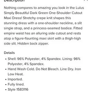 Chic one-shoulder design. Dark green hue. Elegant maxi length with side slit.