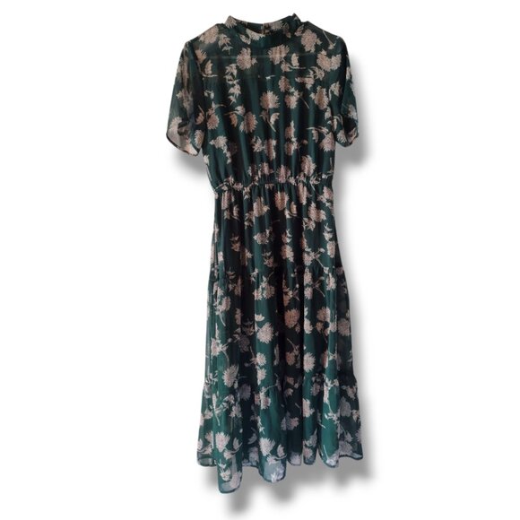 "Get a lovely look for an evening out with the Lulus Floral Dressed Up Dark Green Floral Print Midi Dress! Elegant cream and black floral print embellishes lightweight woven chiffon as it forms a mock neck (with back button closure), sheer decolletage and short sleeves, and a darted bodice. Elastic waist tops a tiered skirt that flows to a modest midi length. Pair with strappy heels and a clutch for the perfect date night 'fit!"