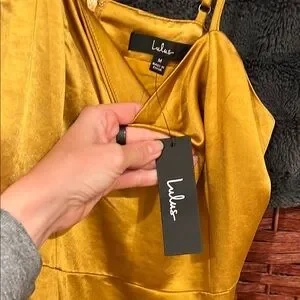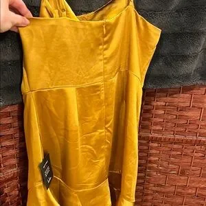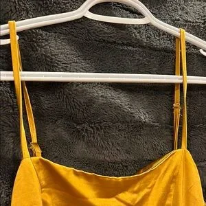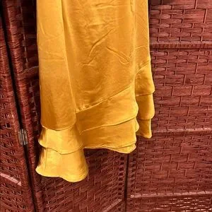 Vibrant gold mini dress. Features spaghetti straps and tiered ruffle hem. Perfect for summer outings.