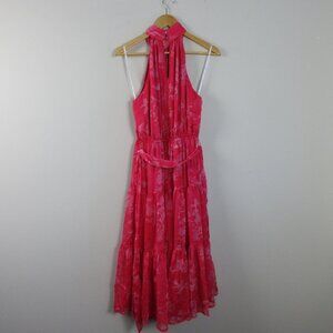 Lulus Halter Tiered Midi Dress S Hot Pink Floral Float to You Boho Cocktail 364
