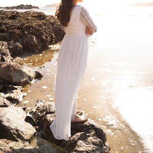 Lovely crochet floral lace creates a V-neck and back (with a nude mesh insert), fitted long sleeves, and darted bodice. A high waist sits above a contrasting chiffon full maxi skirt with a side thigh-high slit.