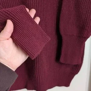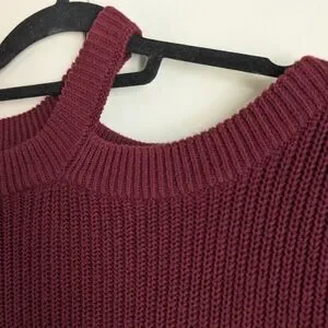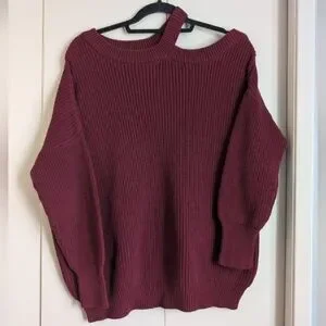 Cozy ribbed knit with an asymmetrical off-the-shoulder neckline. Relaxed silhouette for easy layering. Deep burgundy tone for a chic, versatile look. Soft fabric that dresses up or down.