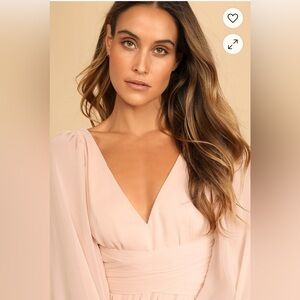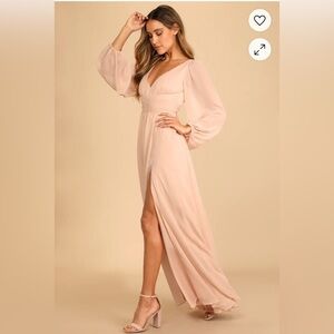 Enchant My Love Blush V-Neck Long Sleeve Maxi Dress This stunning pink gown by Lulu's features a wrap design with a side slit and a ruched waist for a flattering fit. The long bishop sleeves and v-neckline add a touch of elegance, making it perfect for weddings or cocktail events. Its flowing silhouette and soft fabric create a romantic and graceful look.