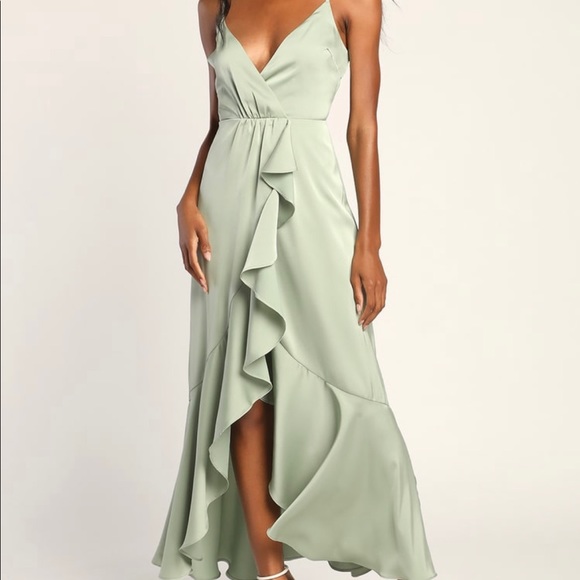 Elegant sage green dress. Features ruffle details. Sleeveless with a deep V-neckline. Perfect for special occasions.