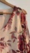 Beige Chiffon with a rust red orange and sage green print forms a roomy shift silhouette with a deep scoop neckline.