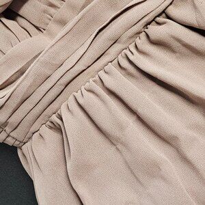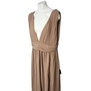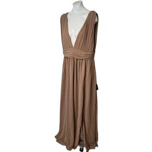 Elegant tan maxi dress by Lulu's. Features a deep V-neck and high slit. Perfect for formal occasions.
