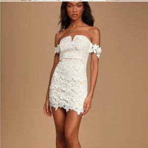 Lulus Exclusive! Jetset in style in the Lulus Venice Villa White Crochet Lace Off-the-Shoulder Mini Dress! Floral crochet lace, atop a nude knit liner, shapes this adorable little dress that features a notched, off-the-shoulder neckline with a hidden V-bar and no-slip strips, and sheer short sleeves. Princess-seamed bodice and fitted waist top figure-hugging bodycon skirt with a flirty mini hem. Hidden back zipper/clasp.