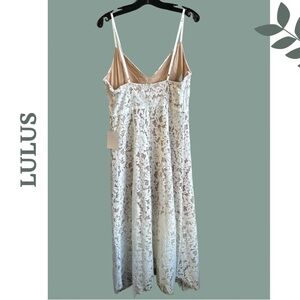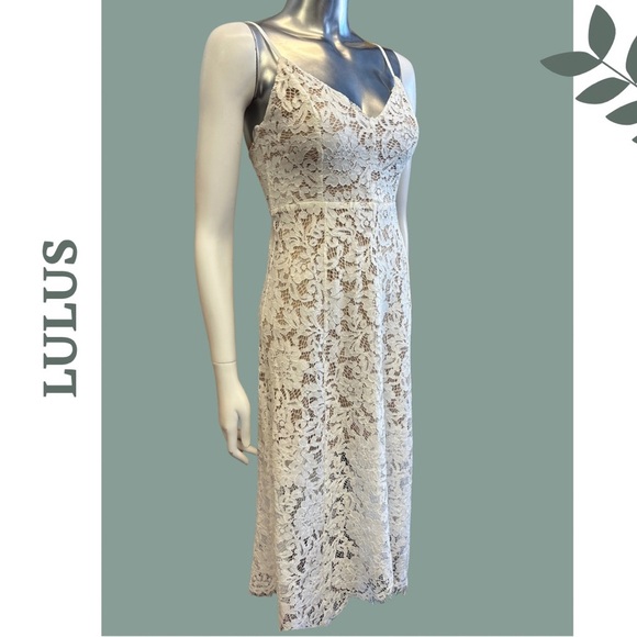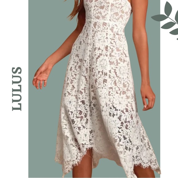 Lulus white lace dress with nude lining. Fitted bodice, full asymmetrical skirt. Back zipper. Fully lined. New with tags
