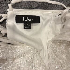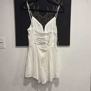 Chic white romper with a textured finish. Features a deep V-neck and adjustable straps. Perfect for summer outings.