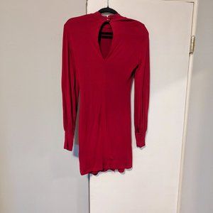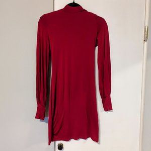 This dress is not super fitted but does hug the body nicely. I am 5ft 2 and it sits at my knee. The back has a key hole opening hat ties with two buttons.