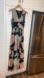 Sleeveless maxi dress featuring a black background with a floral print in shades of pink, white, and green.
