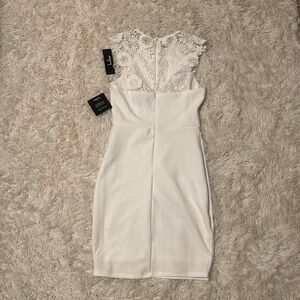 Size XS never worn, brand new with tags. Beautiful white dress with back lace floral detailing.