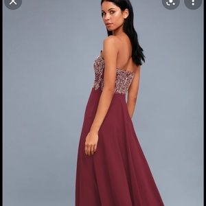 Lulu's Royal romance gown with gold embellished top and burgundy skirt, size S. pictures don't really show the beauty of this dress. The gold color is more accurate on the vide; comes with adjustable straps. I'll also include my garment bag. Perfect condition, worn once. Measurements: pit to pit 17in, waist 13, length from end of gold area to bottom 40.5in