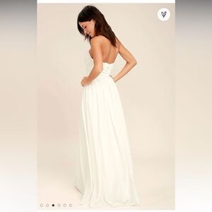 Lulu’s Love and Be Loved Ivory Strapless Maxi Dress Size M Armpit to armpit 15” Waist 13.5” Length 51” Hidden back zipper Lined 100% polyester Excellent preowned condition *please note stain on the front part of the dress… pictured A64-17