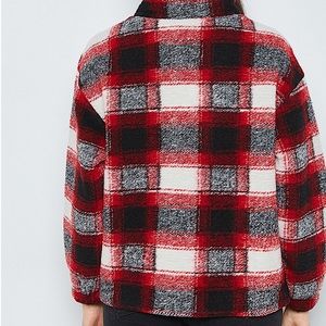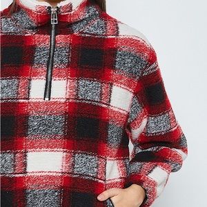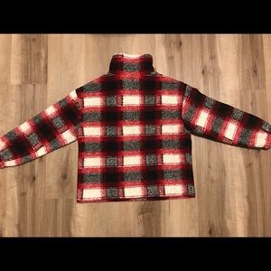 Great condition and super comfy 😊 pullover, half zip. Very thick and warm. Restricted material, not stretchy. Soft inside. Fuzzy on the inside.