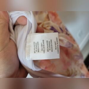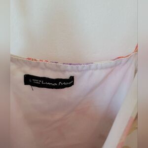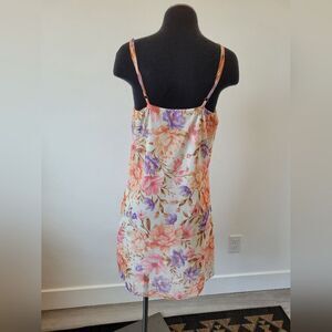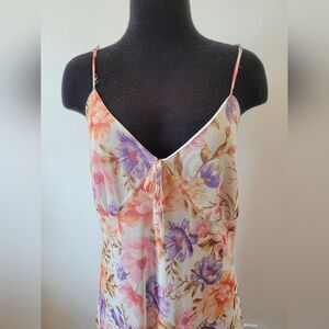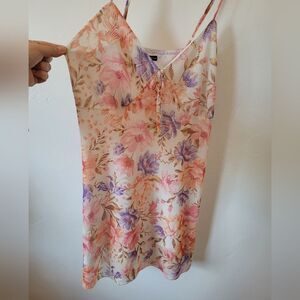Cute little dress with a fun floral print. Babydoll style with an Empire waistline and adjustable spaghetti straps. It is lined. Good condition. Size large measures approximately 38 inches long 16 inches underarm to underarm laid flat.