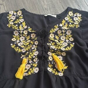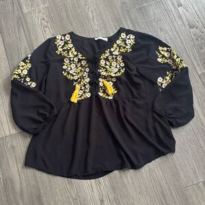 Luna Moon | Yellow and White Floral Embroidered Black Blouse Size Large