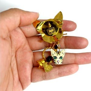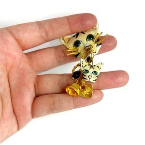 Here is a pair of Lunch At The Ritz cat face earrings. From the bottom of the larger cat face dangles a smaller one. The larger one measures 1 1/2" X 1 3/8" and the smaller one 5/8" X 5/8". There is such great detail on the enamel parts with no imperfections. From top to bottom they measure 2 3/4". They are signed on the back below the posts and on the backs of the dangling hearts. Excellent condition with just some minor scuff marks.