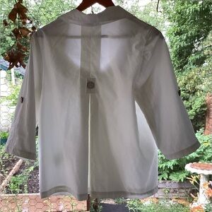 Light fabric, 3/4 rollable sleeves, faux pockets, pleated back. Boxy cut, large buttons and feminine collar. Size 12.