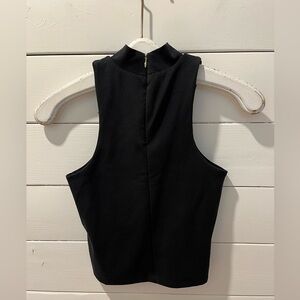 Structured black sleeveless crop top with a mock neck and back zip closure. Made from a soft, stretchy blend of polyamide, cotton, and elastane. Sleek and minimalist, ideal for layering or wearing alone.
