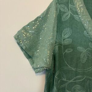 • Features: V-neck, short sleeves, side pockets, tunic style, floral embroidery with clear sequin detail, plain linen back