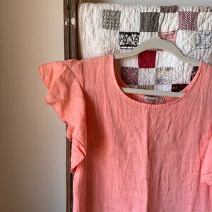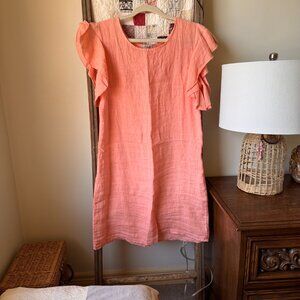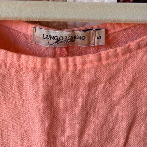 Lungo L'arno 100% Linen Mini Dress. Salmon Pink colour. Semi-Sheer. Wear a slip underneath or wear over a bathing suit on your next beach vacation. Super soft and flowy linen. Oversize fit for it being a small.