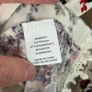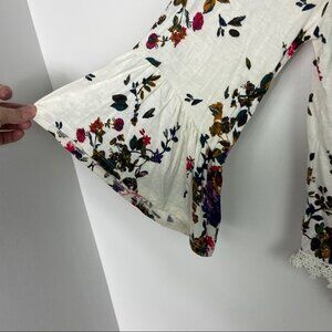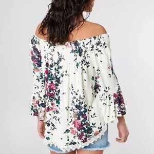 Luq Eyeshadow Off The Shoulder Top in Multi Print and Women's Size Small. Elasticized floral print top with bell sleeves and crochet trim. Rayon and spandex. Made in China. Very good pre-loved condition. Minor spot - see photos.