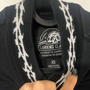 Black long sleeve crop top with barbed wire trim on collar and cuffs. Features a mock neck and fitted silhouette – perfect as a statement piece or for layering. Worn only once!