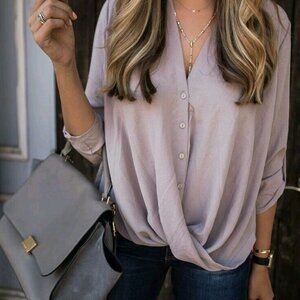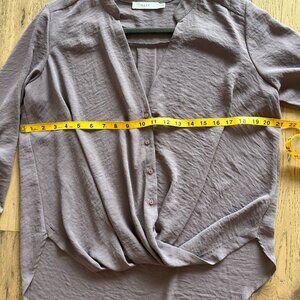 Elegant blouse in a gray/purple colour. Features a button down front with 3/4 length sleeves. Pair it with jeans or tuck it in and wear it to the office with a nice pair of trousers. Worn a handful of times. In very good condition.