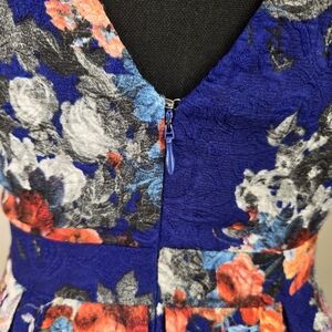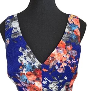 Elegant sleeveless dress with a vibrant floral pattern. Features a mix of blue and black with colorful floral accents. Length 33" Bust 32" Waist 26"