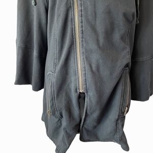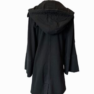 Lush Ladies Black Long Sleeve Jacket. Has Drawstrings on Hood and Two Front Pockets with Zipper Closure. Off Centre Zipper down the Front. Features Wide Sleeves and Stretchy Material.