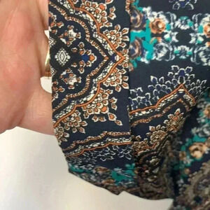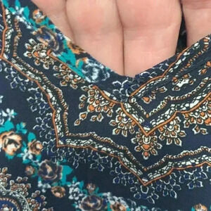 This piece has such a nice cut/shape to it. Interesting pattern with vibrant teal. Tailored sleeve with no defined shoulder. V at front and back.