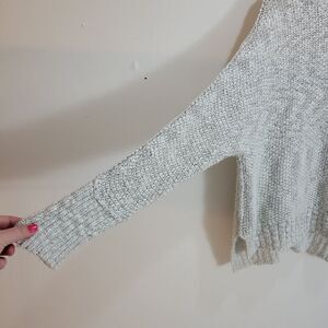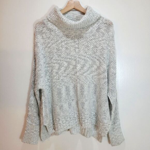 Lovely oversized fit heathered light gray knit cowl neck sweater by Lush. Gorgeous soft cool touch feel. Great used condition no stains or tears. The perfect cosy slouchy Fall sweater. Labelled size S/M but could also fit a large as it's an oversized style fit and has natural stretch. The hem is a couple inches higher in the front than the back, and has side splits.