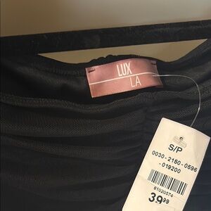 Chic black mini dress by Lux. Features ruched detailing. Perfect for a night out.