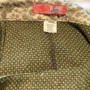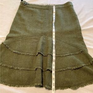 Has pleats in the front, ruffles in the back, and side zipper with buttons.