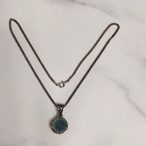 Luminous and Luxe Chalcedony and 925 Sterling Silver and 18k Gold accented Pendant on a Substantial 925 Sterling Silver Chain with ChromeHearts and David Yurman vibes. The colour of the faceted Chalcedony gemstone is breathtaking - an almost milky and deep ocean shoreline. The stone is expertly bezel set in an ornate and heavy sterling silver frame complemented by genuine 18k Gold accents. The large bale on the pendant is also beautifully detailed. The back of the pendant has three clear Hallmarks: Artist signature "g" in lower-case script, 925, 18k. The curb chain is hallmarked 925 ITALY. Chain measures approx 16" in length; pendant measures approx 12mm in diameter and hangs approx 29mm including bale.