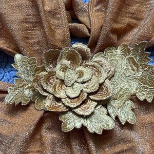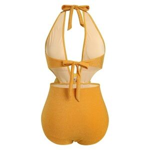 Embrace beach elegance with this gold lurex one-piece, featuring a halter style with a deep V-neckline, a self bow tie at the low back, and a halter tie for support. It includes removable soft pads for customizable comfort, is fully lined, and offers moderate back coverage for various occasions. Embellished with a blooming flower cluster at the waist center, this gold-tone monokini stands out on its own, offering versatility. Notable for its shimmering, metallic sheen, this luxury swimwear combines curved lines, sculpted support, and flattering shaping, marrying femininity with a flourishing romance.