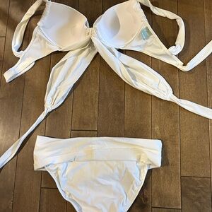 Elegant white bikini set by Luxe sauvage. Features a stylish knot design. Perfect for beach days.