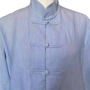 Tags :Luxury linen jacket, designer jacket, Alain Figaret, Figaret Paris, made in Italy, French fashion, mandarin collar jacket, light blue linen, minimalist style, expensive jacket, chic outerwear, elegant layering piece, classic European fashion, high end jacket, natural fabric clothing, breathable summer jacket, rare designer find, medium large fit, oriental inspired style, timeless fashion.