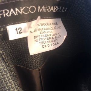 Franco Mirabelli designed, made in Canada size 12 statement coat. It is ankle length with long slit in the back. The colour is a black and dark green tone with green lining. PTP 19” length 55” sleeve 24”.