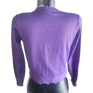 Elegant purple women's cardigan with a stylish scalloped design. Has 1 hook and eye front closure.
