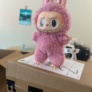 Exciting Macaron Lychee Berry Labubu! This Labubu is a bright pink and is unopened in the box. A reference Labubu of the same colour is standing on the box.