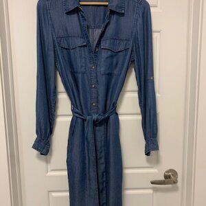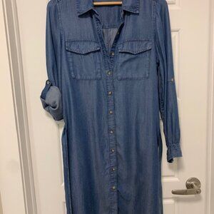 Flap pockets in front. Shirt-dress with link. Pockets on the sides of the shirt-dress.