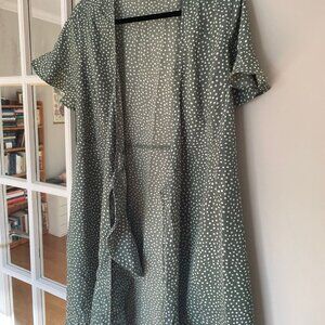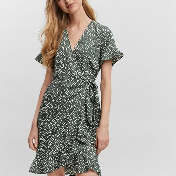 Brand new, never worn, without tags. Vero Moda green wrap dress with white polka dots. The sleeves and hem of the dress have a sweet ruffle/flutter detail.