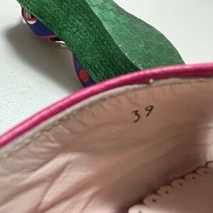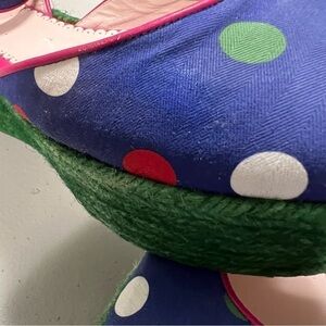 Very good condition - some spots on the blue area has been touched up - please see last 2 photos - not really noticeable as it is the same shade of blue. Colorful espadrilles with ankle straps. My SO calls this my clown shoes 😂 I think it’s cute and can be paired with different colors of clothes.