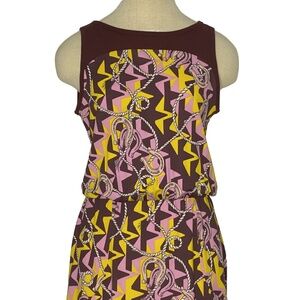 Beautiful sleeveless knit dress by M MISSONI, featuring an eye-catching equestrian-inspired print with horseshoes and rope motifs in maroon, yellow, lavender, and pink tones. Made from a lightweight stretch knit rayon blend, this dress has a comfortable elastic waist and an elegant A-line silhouette that flatters the figure.